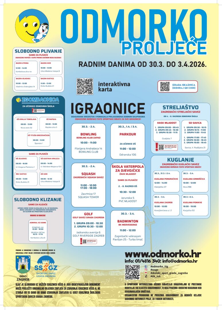 Školski sportski savez Grada Zagreba tijekom proljetnog odmora učenika od od 30. ožujka do 3. travnja 2026. godine organizira program Odmorko proljeće.